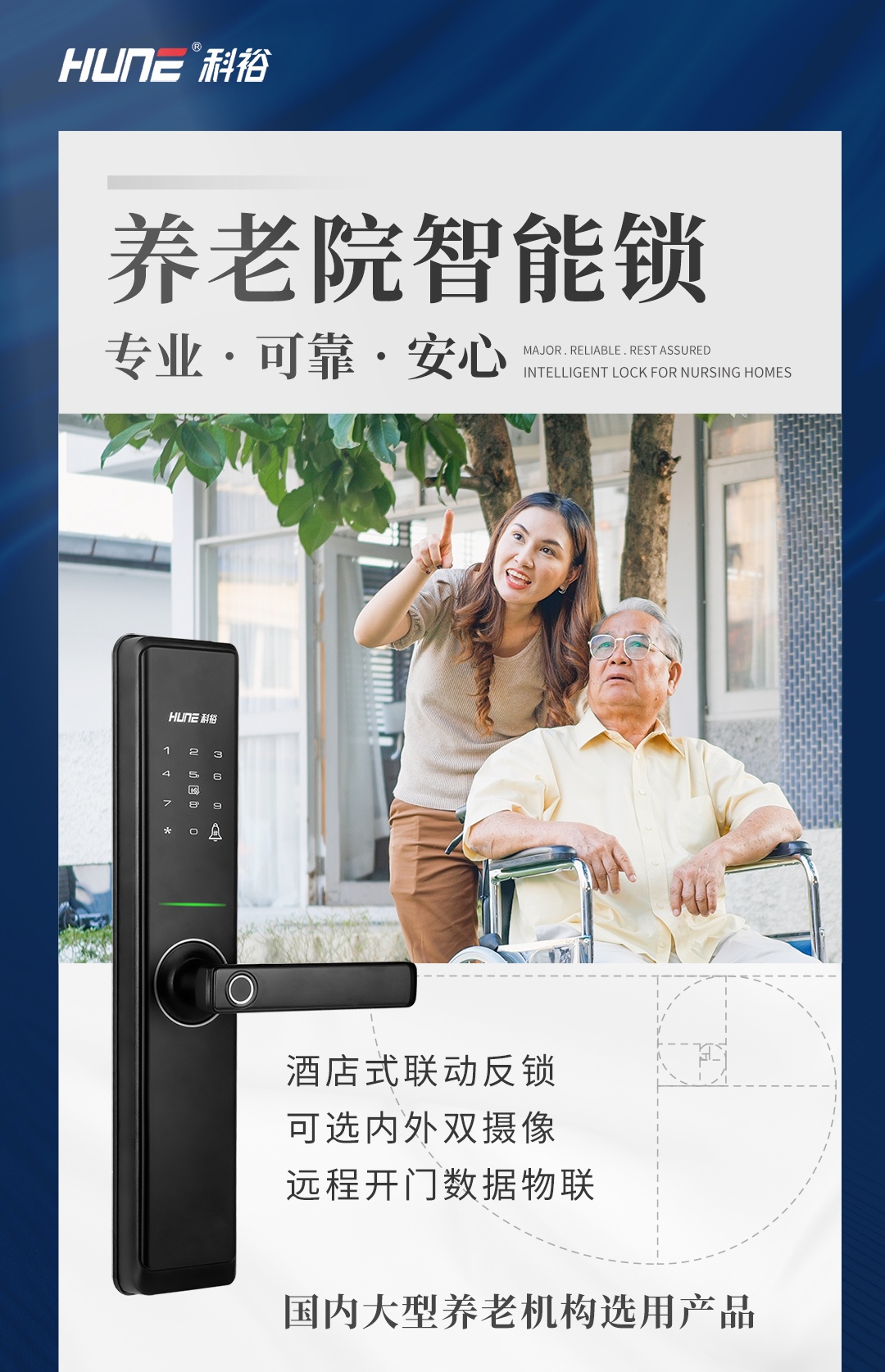根據(jù)泰康之家的需求,科裕聯(lián)網(wǎng)智能鎖針對老年群體的生活場景,除了基本的逃生功能,還考慮到使用城市的環(huán)境狀況、溫濕度、干擾等情況,科裕為其打造一款療養(yǎng)院專用鎖,創(chuàng)新推出定位卡一卡通功能與聯(lián)動逃生功能,為老人量身定制 “主動防護+緊急救援” 的全方位聯(lián)網(wǎng)門鎖解決方案。