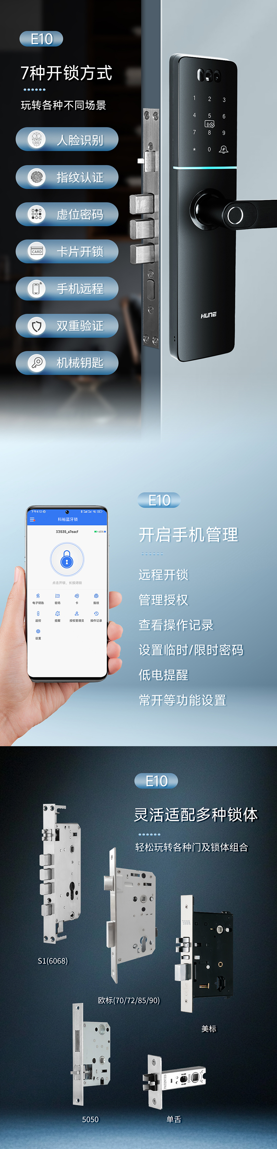 開鎖方式:人臉識別(選配)、指紋開鎖、密碼開鎖、卡片開鎖、鑰匙開鎖、手機開鎖、雙重認證、遙控開鎖(選配)