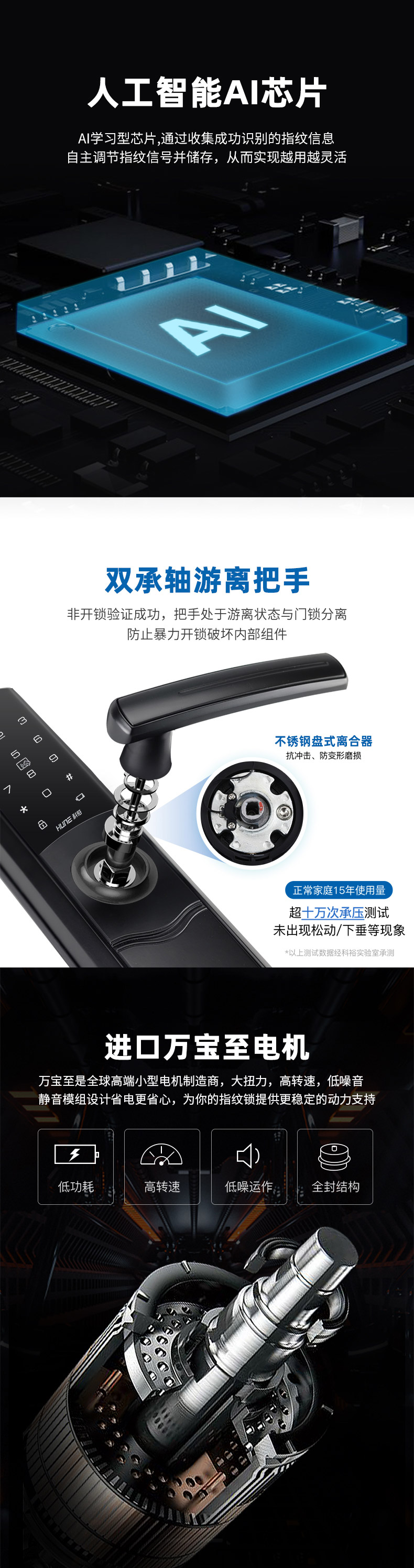1、加厚加重型美標鎖體,全銅鎖芯,國際品牌<萬寶至>精密離合電機,鎖體保修六年;