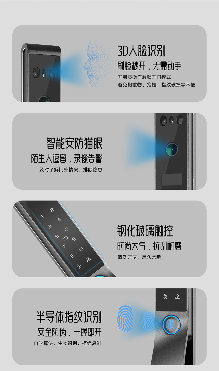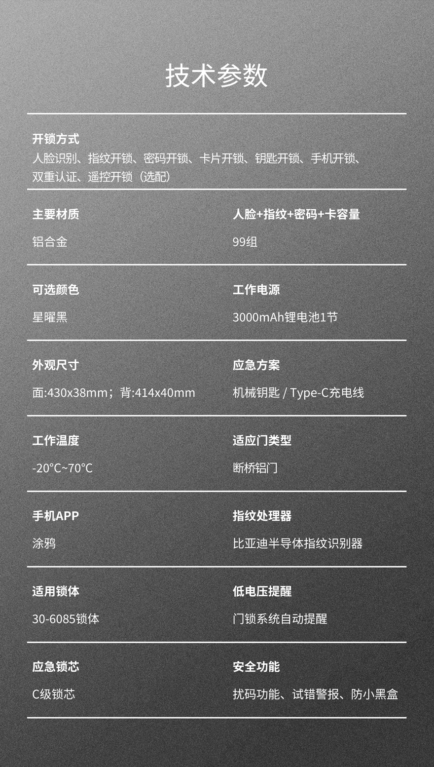 開鎖方式:人臉識(shí)別、指紋開鎖、密碼開鎖、卡片開鎖、鑰匙開鎖、手機(jī)開鎖、雙重認(rèn)證、遙控開鎖(選配)