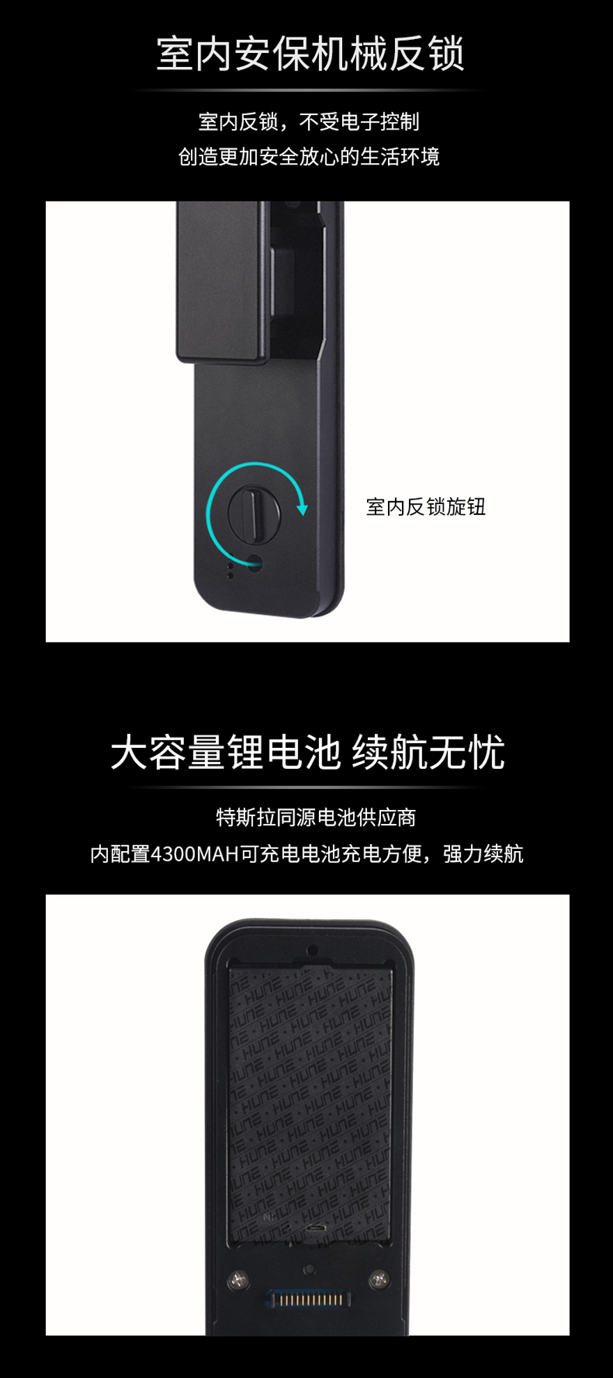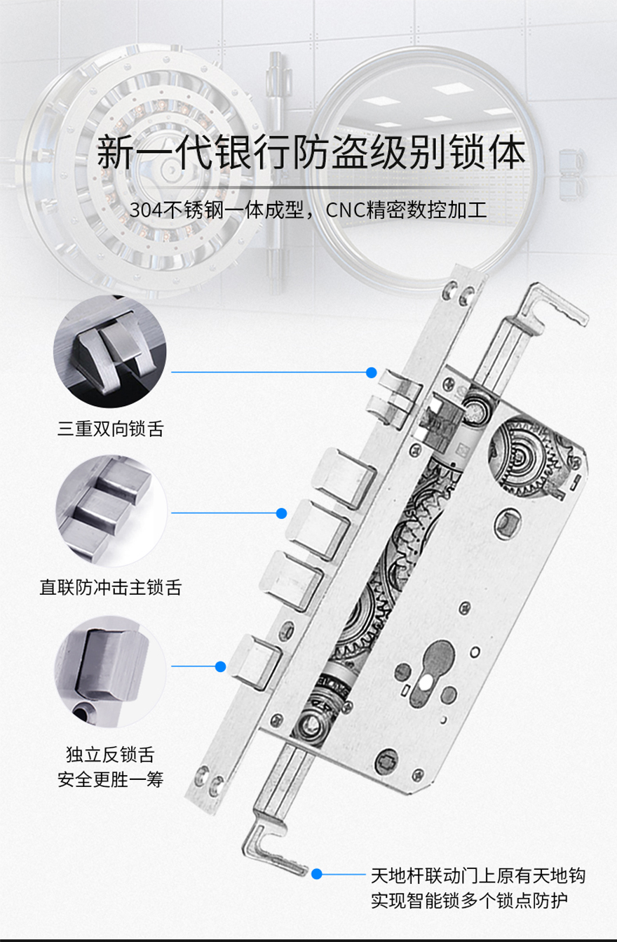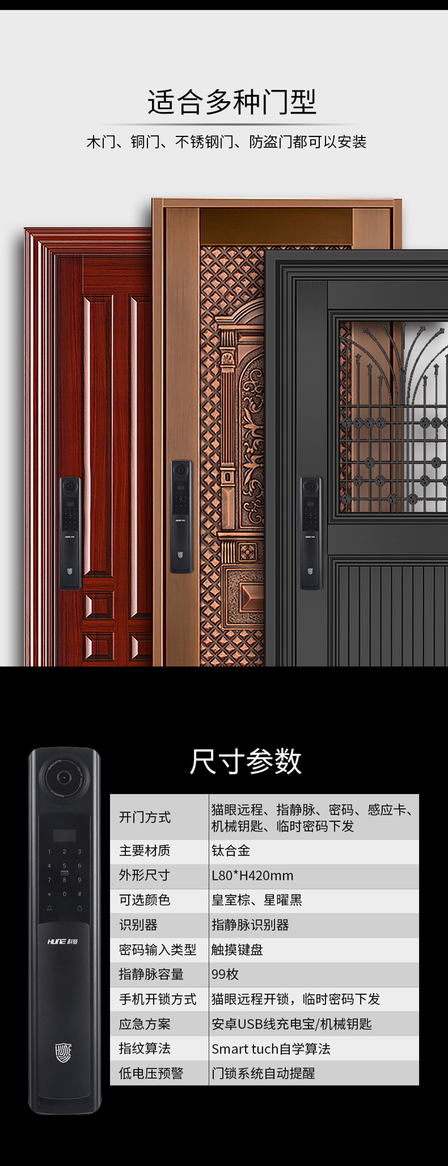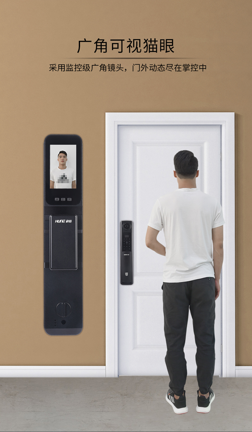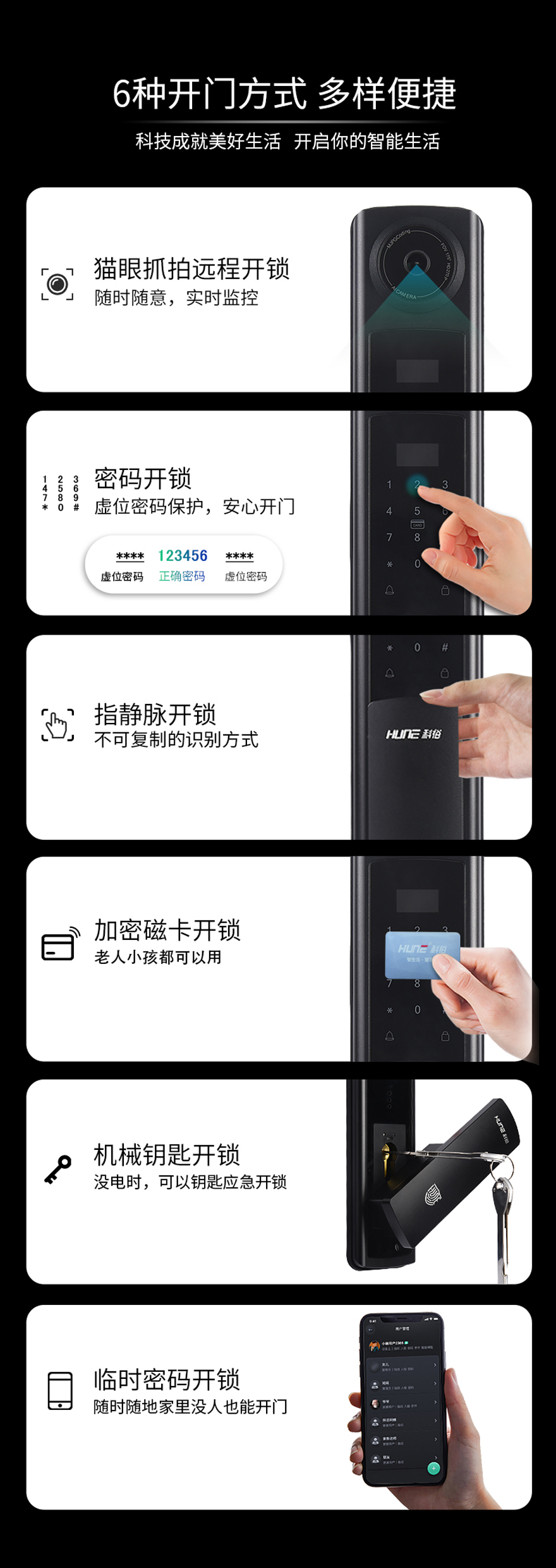 開門方式:密碼、鑰匙、感應(yīng)卡、微信臨時密碼、人臉識別(選配)指靜脈識別(選配)、貓眼抓拍(選配)