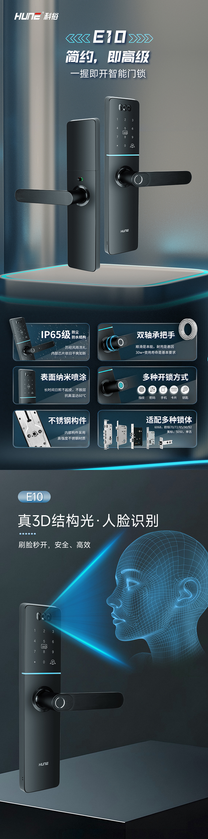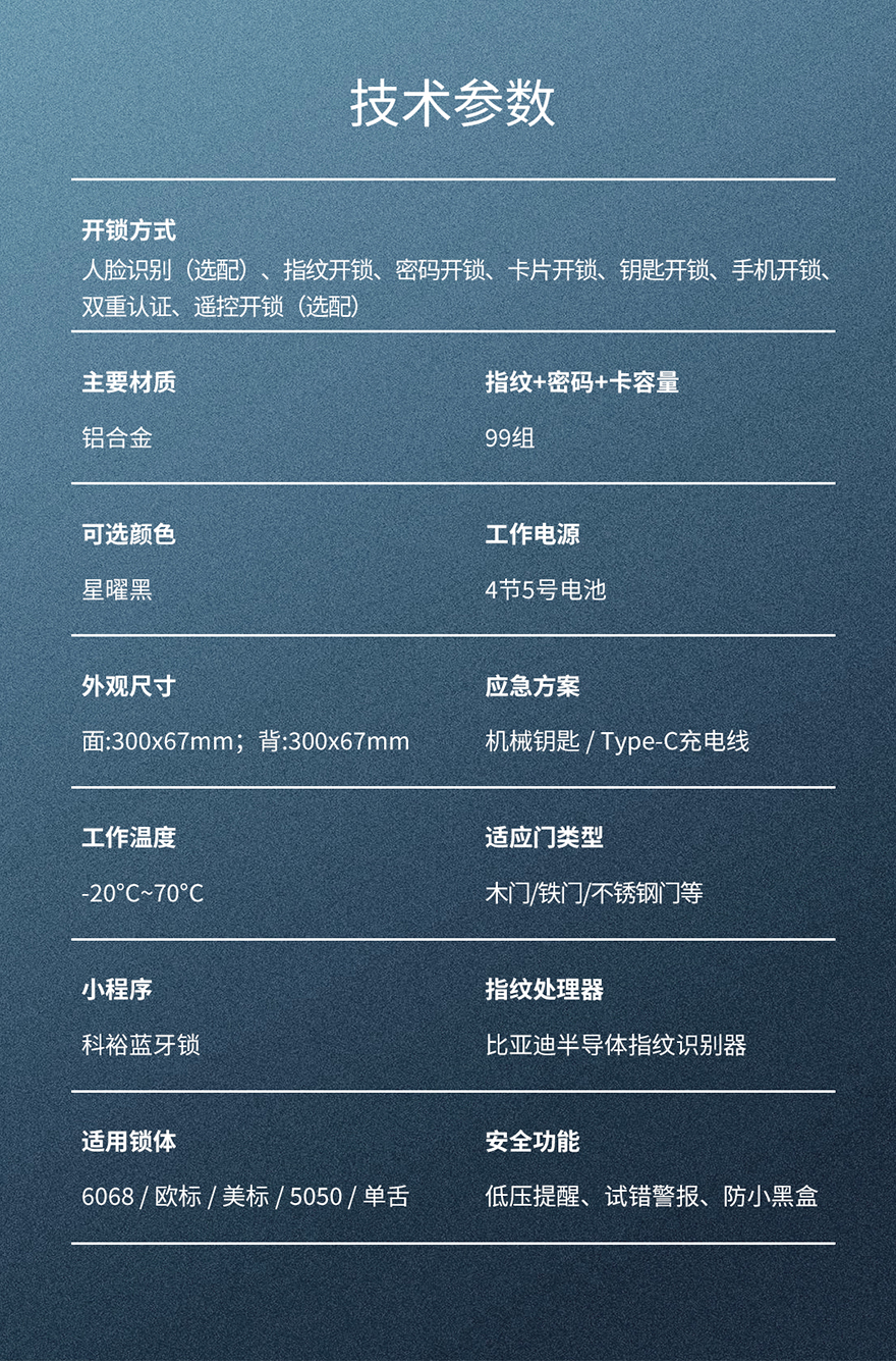 開鎖方式:人臉識別(選配)、指紋開鎖、密碼開鎖、卡片開鎖、鑰匙開鎖、手機開鎖、雙重認證、遙控開鎖(選配)