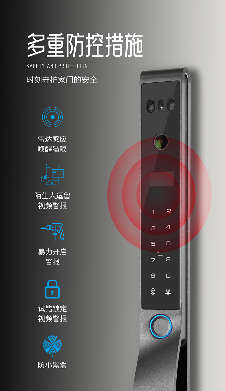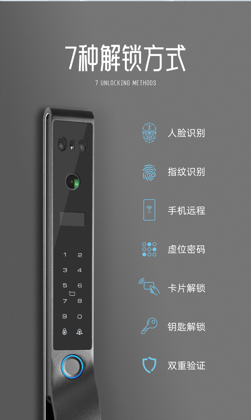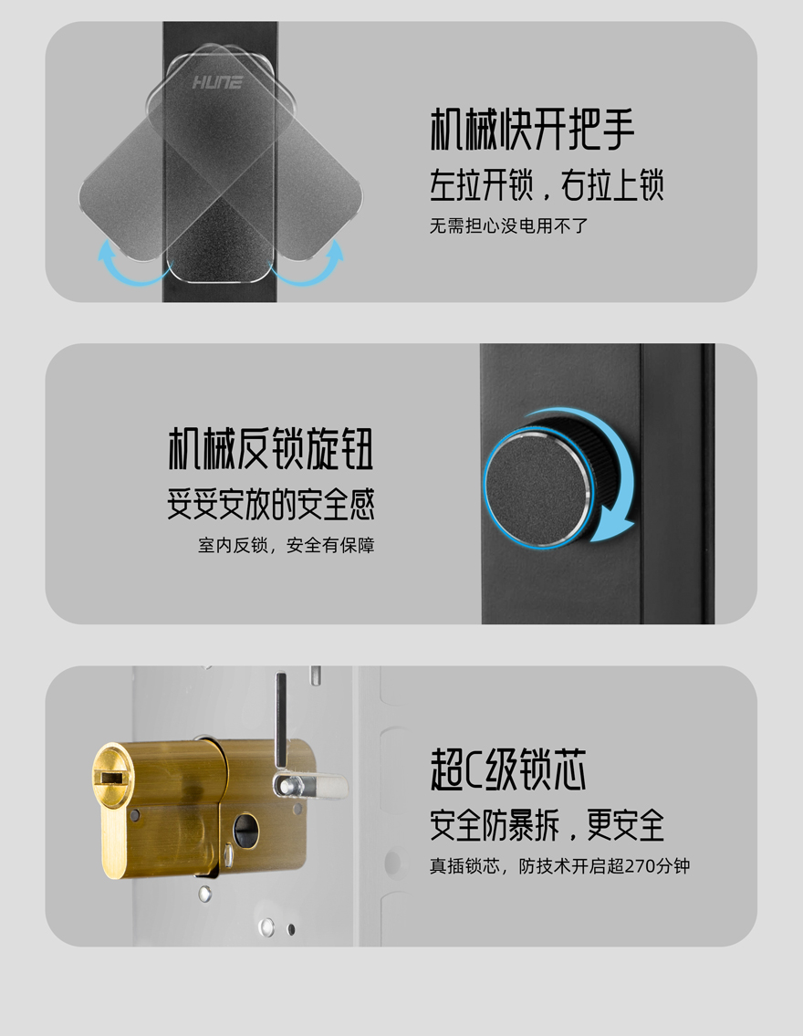 開鎖方式:人臉識(shí)別、指紋開鎖、密碼開鎖、卡片開鎖、鑰匙開鎖、手機(jī)開鎖、雙重認(rèn)證、遙控開鎖(選配)