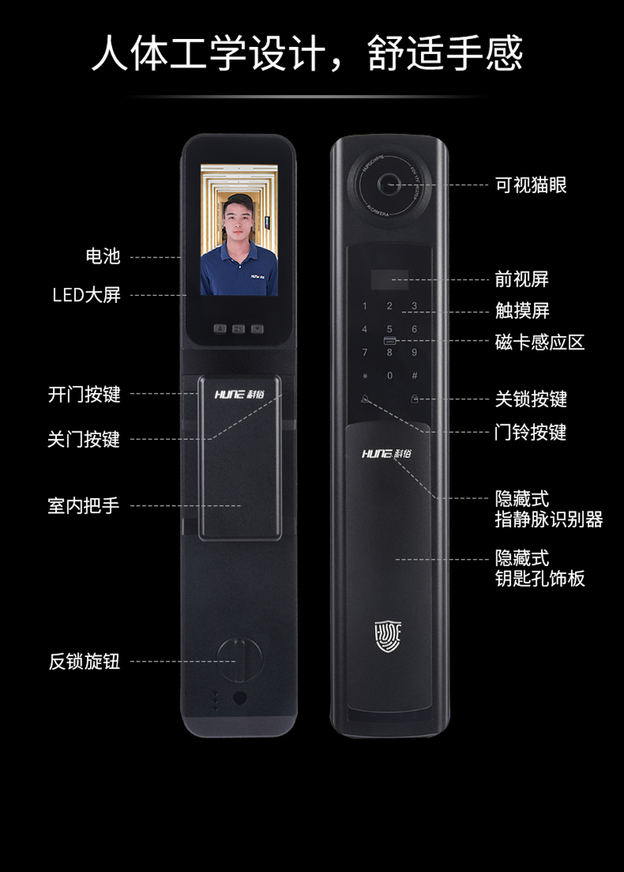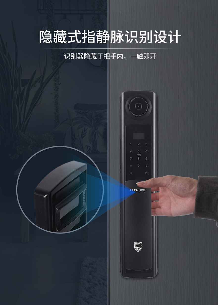 開門方式:密碼、鑰匙、感應(yīng)卡、微信臨時密碼、人臉識別(選配)指靜脈識別(選配)、貓眼抓拍(選配)